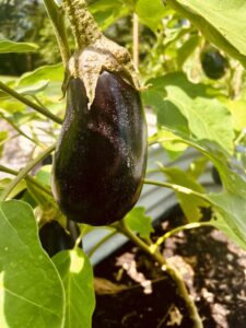 Once planted you’ll want to be sure to provide at least 6-8 hours of full sun daily. Honestly, with eggplants, the more the better. Provide consistent watering, letting the soil dry a bit between watering. Fertilise regularly with a balanced fertiliser and consider adding organic matter or compost to your container.
