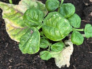 ~ Look for pale stippling or yellowing of leaves. While this often appears physiological, in this region, it might mean leafhoppers. Using row covers or silver reflective materials can prevent infestations, but if you already have them, spray the foliage with an insecticidal soap.