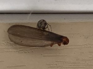 Well yeah for the spider! It is not a cranefly and my apologies for the misdiagnosis. It appears to be a flying ant or termite. The do not do much plant damage and birds and spiders usually keep them under control so this is not an insect to worry about. Just make sure they don't go burrowing into any wet or damaged wood of your home. Sometimes these flying critters arrive with loads of bark chips or wood chips. Keep growing, Marianne Binetti